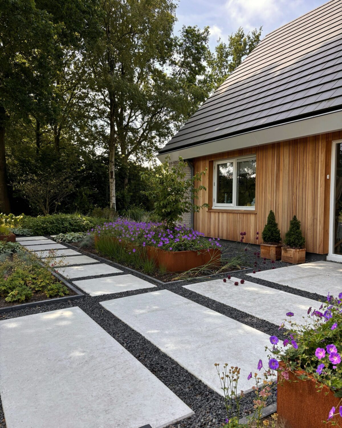 Bloemrijke voortuin met cortenstaal bakken.
